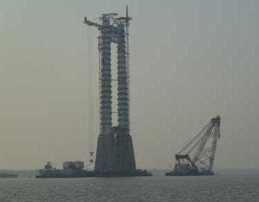 中塔施工现场远景图,泉州睿诚旅游产品设计有限公司是国内第一家将复合润滑涂层用于桥梁润滑系统,国内第一家将鞍座之间摩擦系数达到0.04,桥梁鞍座与座体之间润滑结构已获国家专利,已在国内多座大型跨江桥梁应用此润滑工程技术。